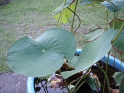 久しぶり蓮池に、新しい種類の芽が。台風を乗り越え蕾になっているが、開花してくれるといいが。